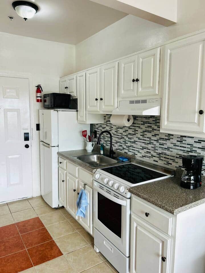 Coffee machine, Cooking utensils, Kitchen stove, Kitchenette, Microwave, Oven, Refrigerator