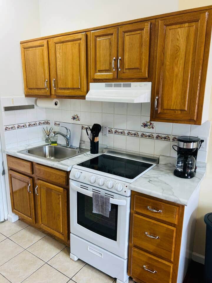 Coffee machine, Cooking utensils, Kitchen stove, Kitchenette, Microwave, Oven, Refrigerator
