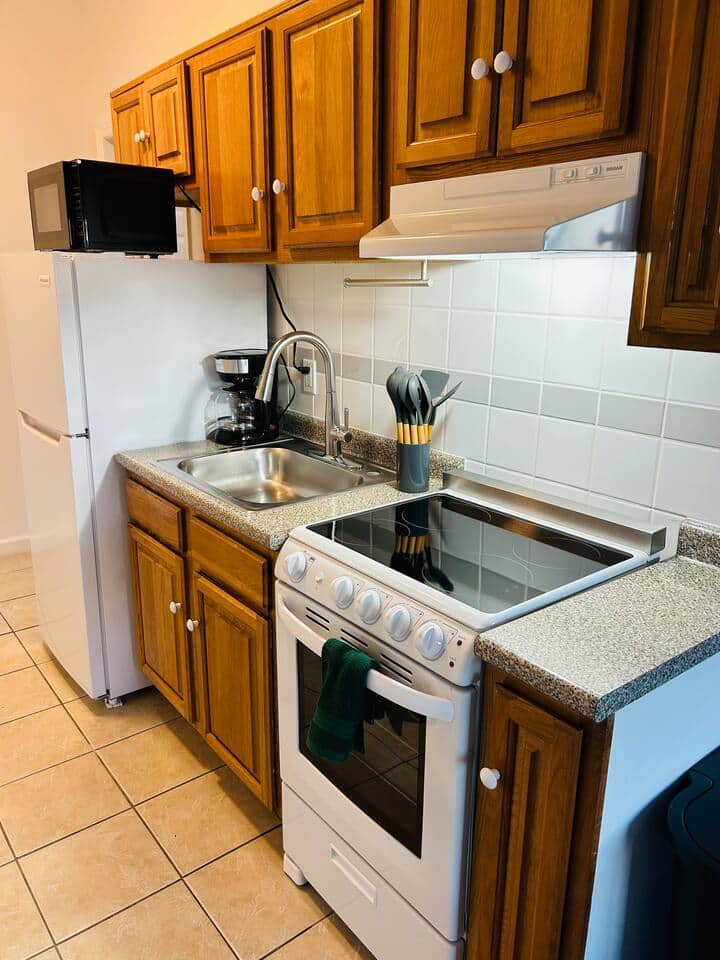 Coffee machine, Cooking utensils, Kitchen stove, Kitchenette, Microwave, Oven, Refrigerator
